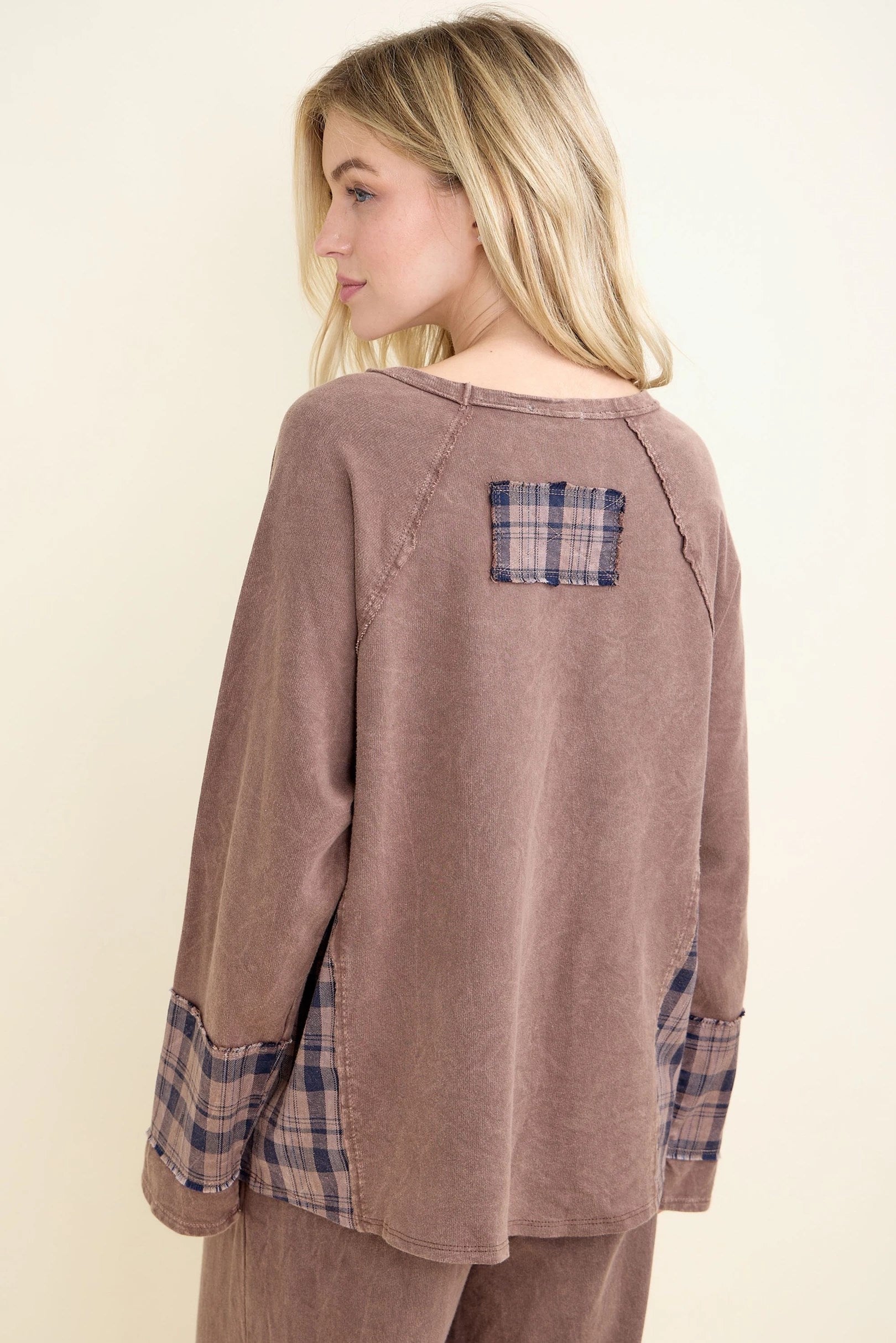 Let your style shine through texture and contrast with our Mineral Wash Distressed Star Plaid Patch Top, a statement piece that balances raw-edge artistry with cozy, lived-in comfort.