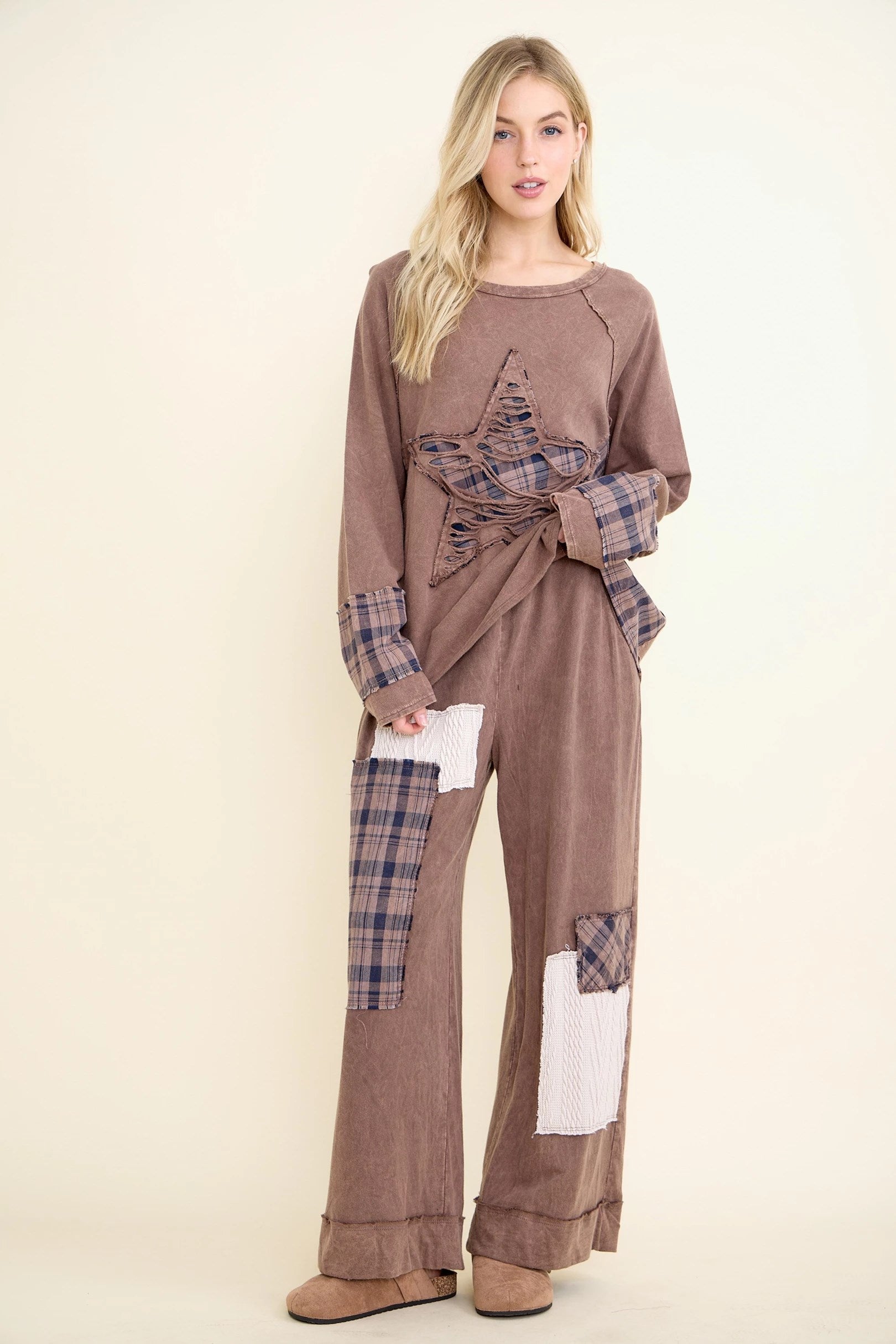 Indulge in cozy artistry with our Mineral Wash Plaid & Sweater Patchwork Boho Pants — a harmonized blend of texture, pattern, and relaxed comfort. These pants fuse mineral-washed fabric with plaid panels and sweater knit patchwork accents for a whimsical, layered aesthetic.