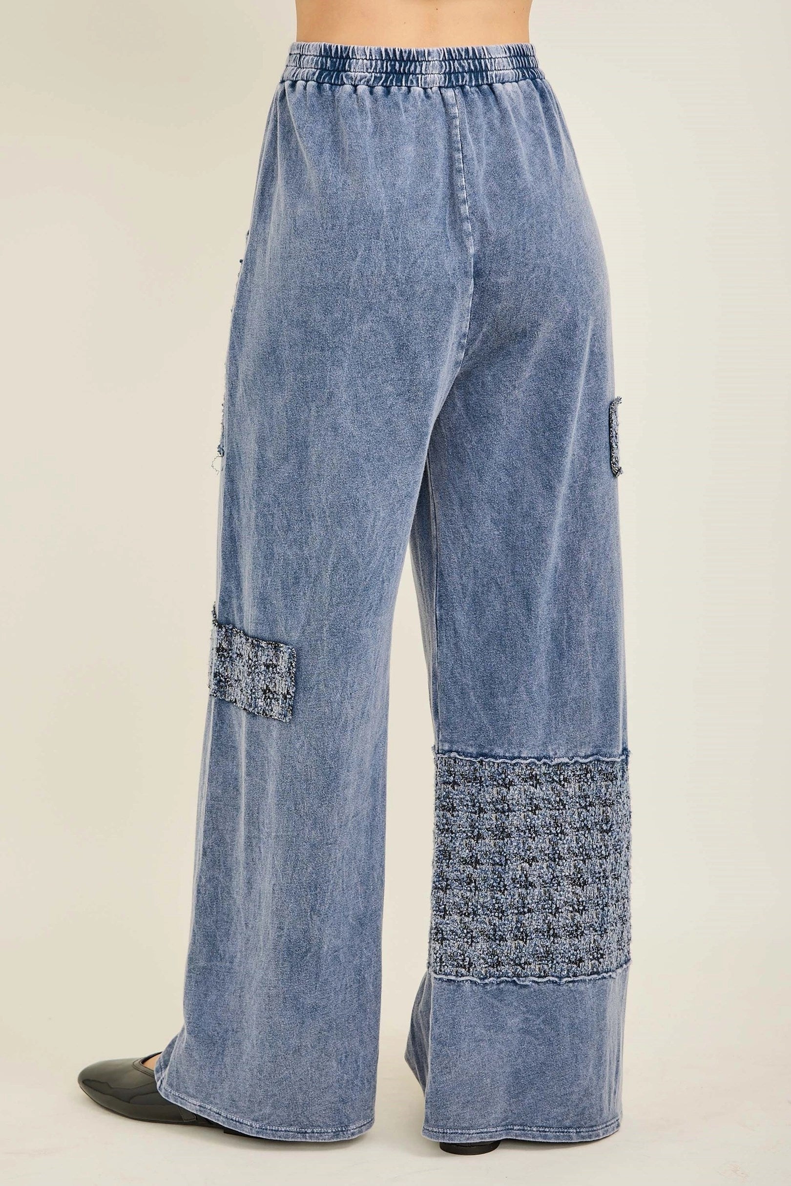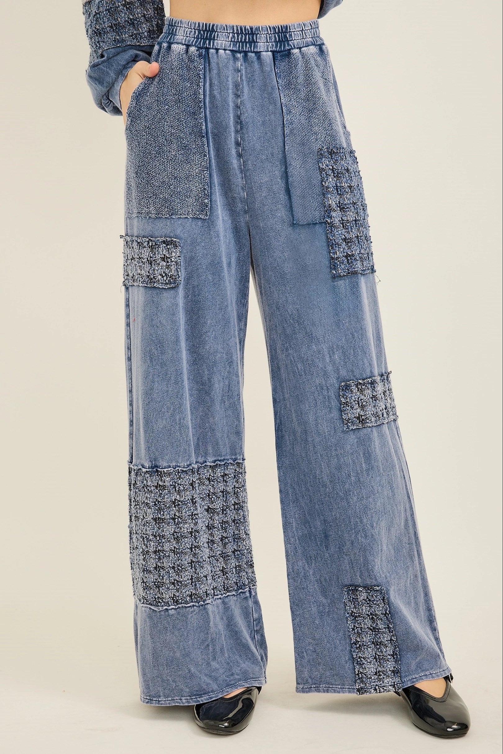 Unveil a stylish, artsy twist on wide leg bottoms with our Mineral Wash Tweed Block Patch Wide Leg Pants — where comfort meets curated detail. These pants blend soft mineral-washed fabric with structured tweed-inspired patch blocks for a unique statement that still flows with ease.