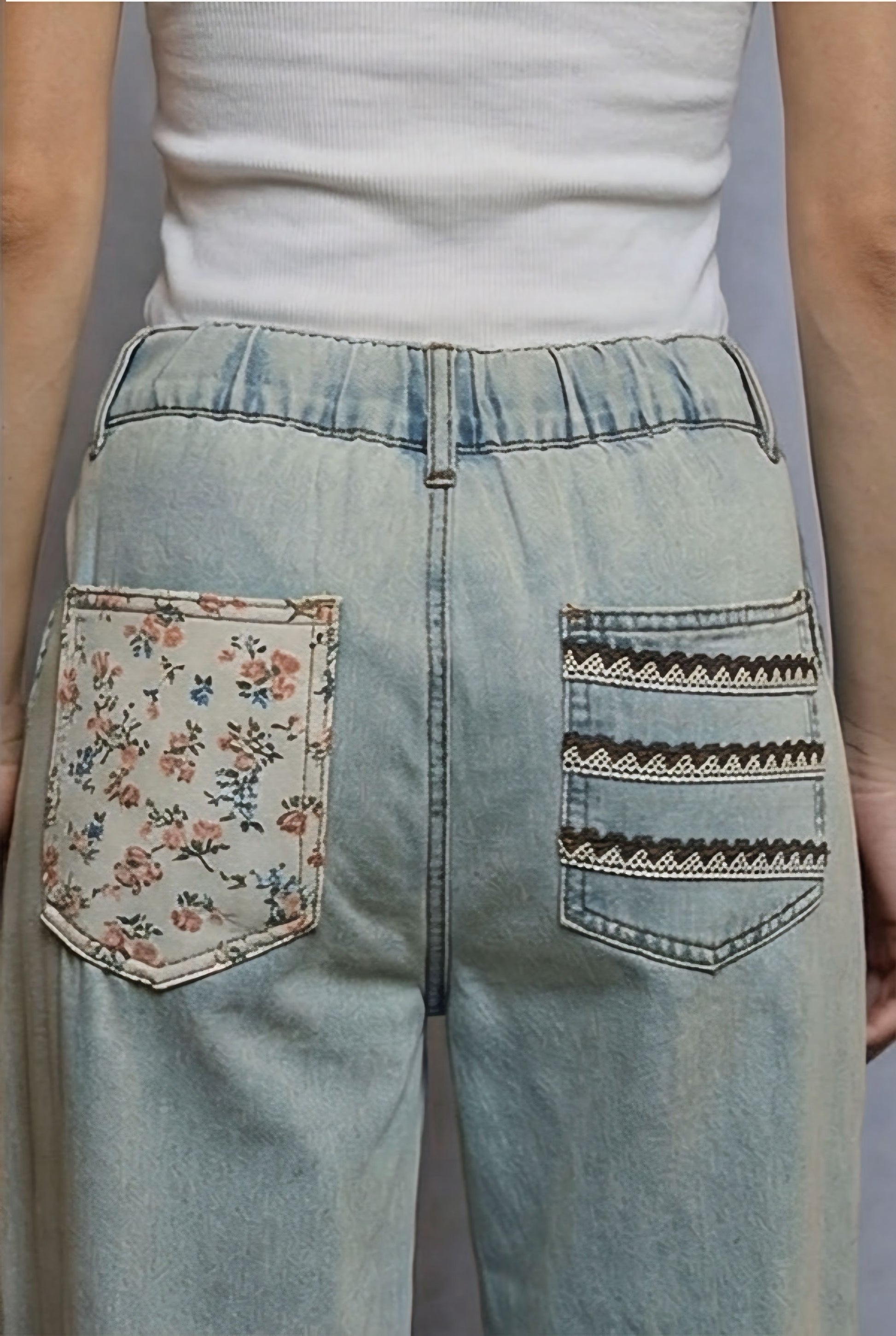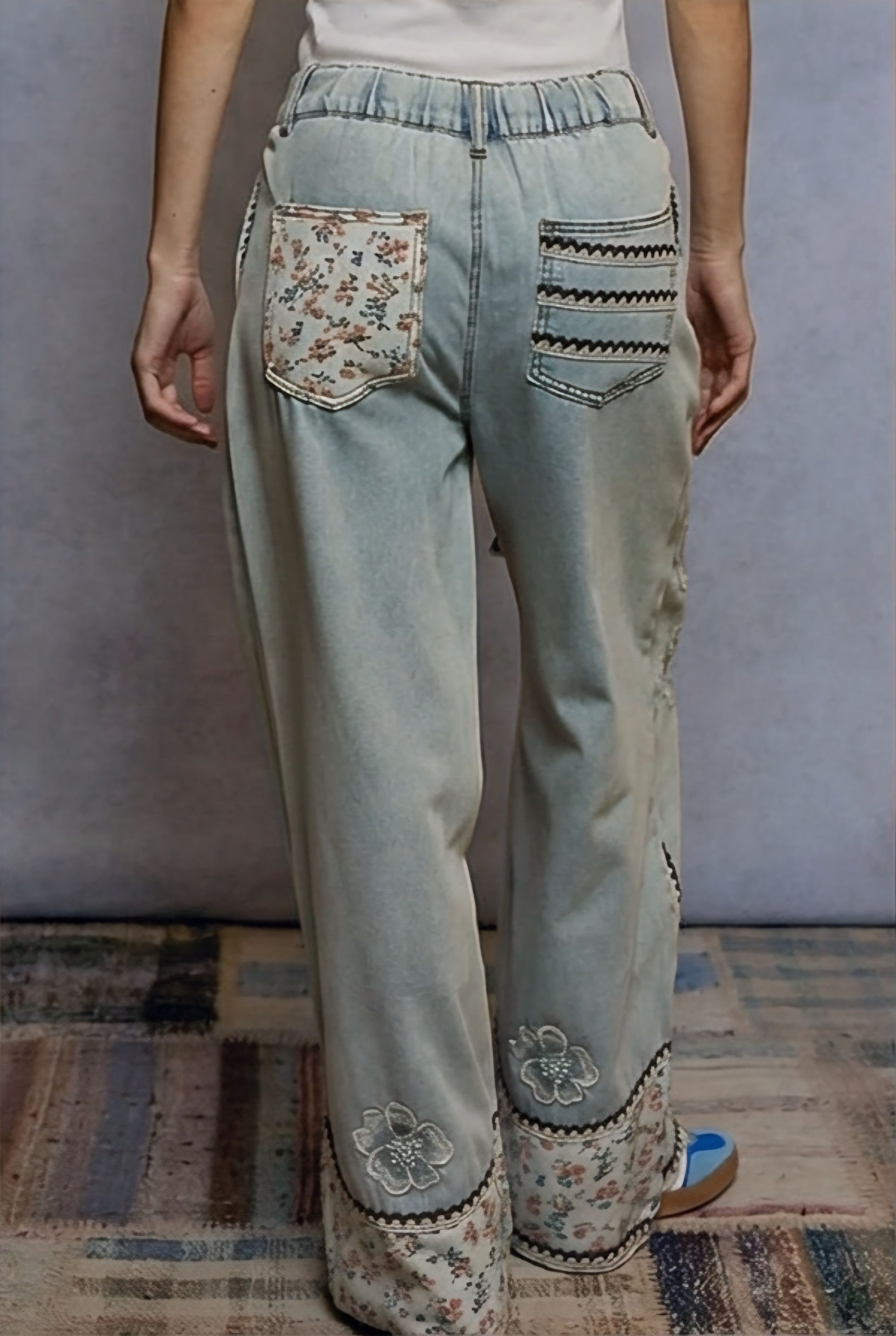Add a touch of playful vintage charm to your everyday style with these Floral Patchwork Relaxed Fit Pants by POL Clothing. Designed in soft 100% cotton denim, these wide-leg jeans feature whimsical floral embroidery along the legs and contrasting floral patchwork at the hem and back pockets. Delicate lace-trim details and multi-pattern stitching elevate the design, making these jeans a statement piece full of bohemian spirit.